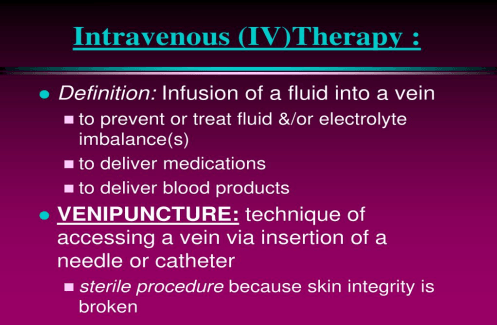 - The course covers IV therapy, arterial puncture, and blood withdrawal. It will prepare students to do the following: recognize complications and reactions, identify the role of IV therapy, differentiate actions, dosages, side effects, nursing implications, and more.